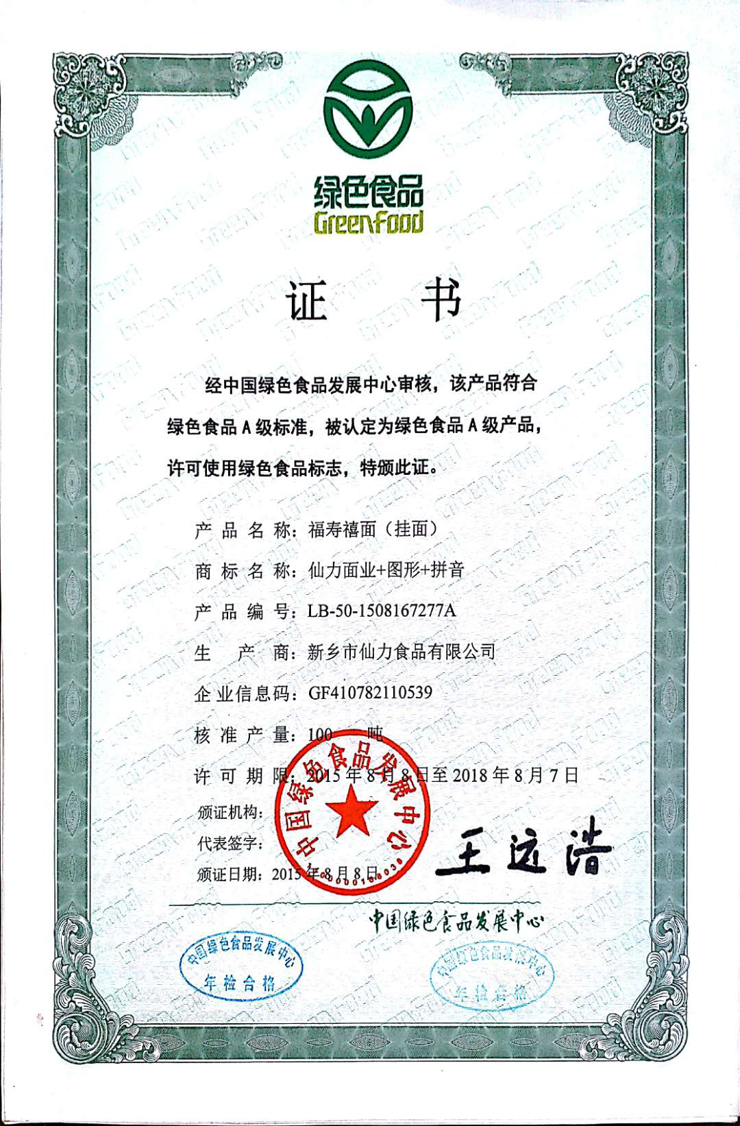 福壽喜面-綠色食品證書